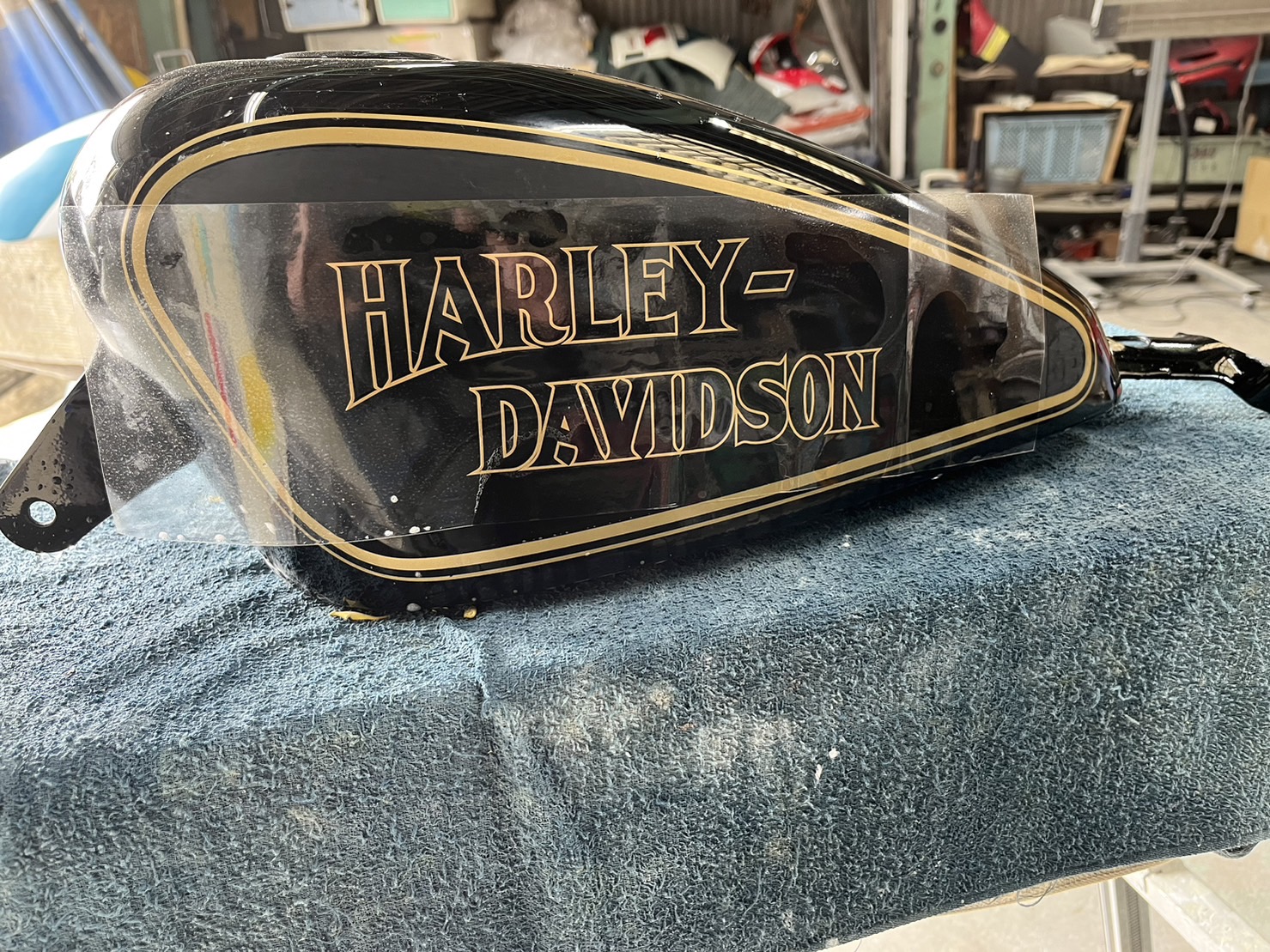 製作途中ではありますが、今回はハーレーのタンク塗装。ステッカーは毎回自作で作っておりますので、お客様の好みのステッカーを作って塗装することができます。