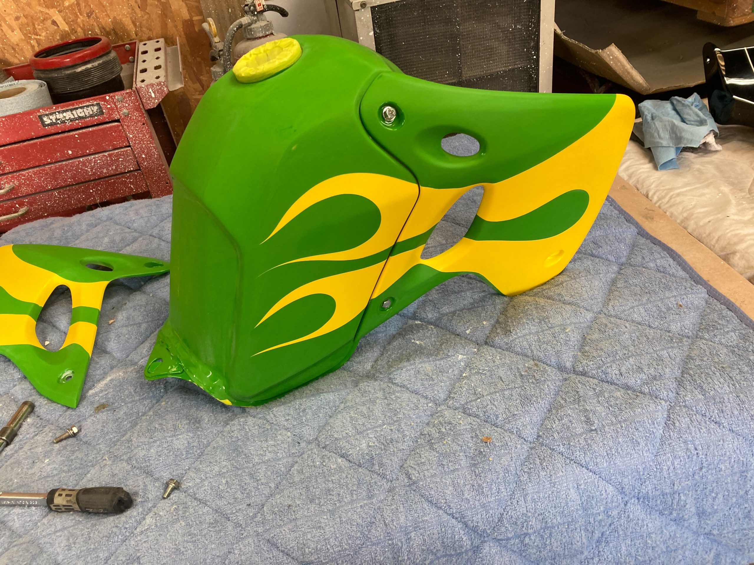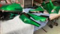 オフロードバイク全塗装 2023.05.18 今回はカスタムペイントの全塗装。デザインは依頼主の注文通りに仕上げました。 フェンダーのデザインはおまかせとのことでしたので、注文されていたデザインに合うように作りました。